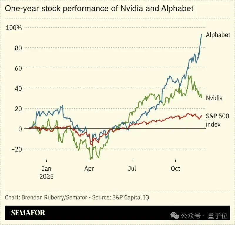 根据金融数据服务商S&P Capital IQ的数据,今年1月至11月期间,谷歌母公司Alphabet与英伟达的股价表现均大幅跑赢标普500大盘。