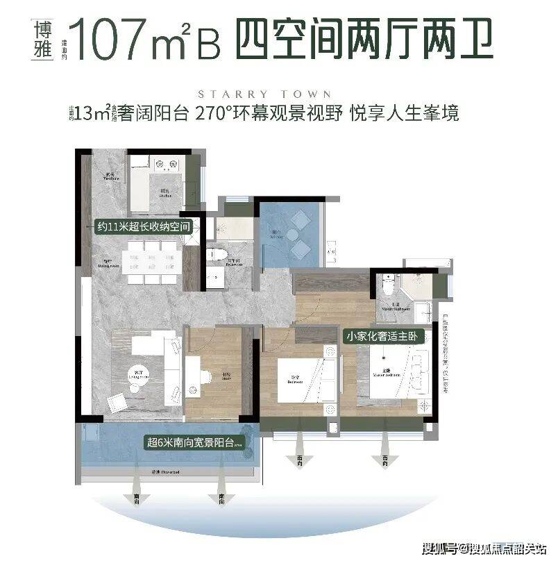 越秀·大学·星汇城在户型设计上独具匠心,尽显人性化与高品质。在售建面约 88 - 125㎡三至五空间,户户朝南,皆配备 270°宽景大阳台,4 - 4.5 面宽朝南,高使用率产品让每一寸空间都得到充分利用。其中 88㎡ 3 空间 2 厅 2 卫户型,罕见四面宽小户型设计,三卧室朝南,超 11 米景观线,让阳光充分洒入室内,精细化收纳约 10 米收纳墙,满足全家人的收纳需求。107㎡A 户型配置南向观景玄关,仪式感入户,4.5 开间朝南,客厅主卧双南北对流,畅享双面宽观景阳台,飘窗拓宽功能空间,交互式方厅可开可合,灵活多变。107㎡B 户型四开间朝南,经典竖厅设计,动静分区合理,多功能空间尺度宽阔,满足二胎家庭需求,精细化收纳超 11 米收纳墙,主卧自带独立衣帽间,尽显品质生活。