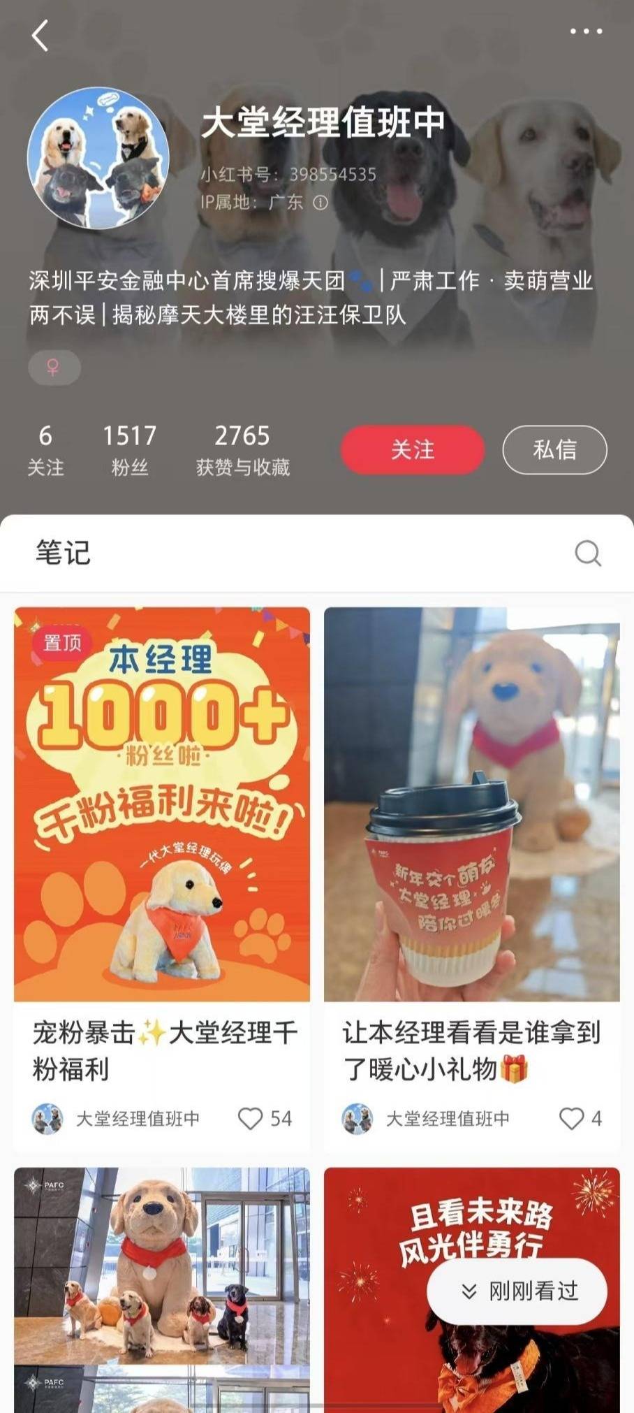 走进平安金融中心大堂,东东的巨型毛绒塑像憨态可掬,耷拉着耳朵。戴着红围巾的模样瞬间戳中人们的“萌点”。据平安集团不动产相关负责人介绍,这“大堂经理”其实早在两年前就小有名气,他们还专门开设了社交账号记录它们的上班日常,去年三月和中秋推出的定制公仔,更是成为观光团的专属福利。