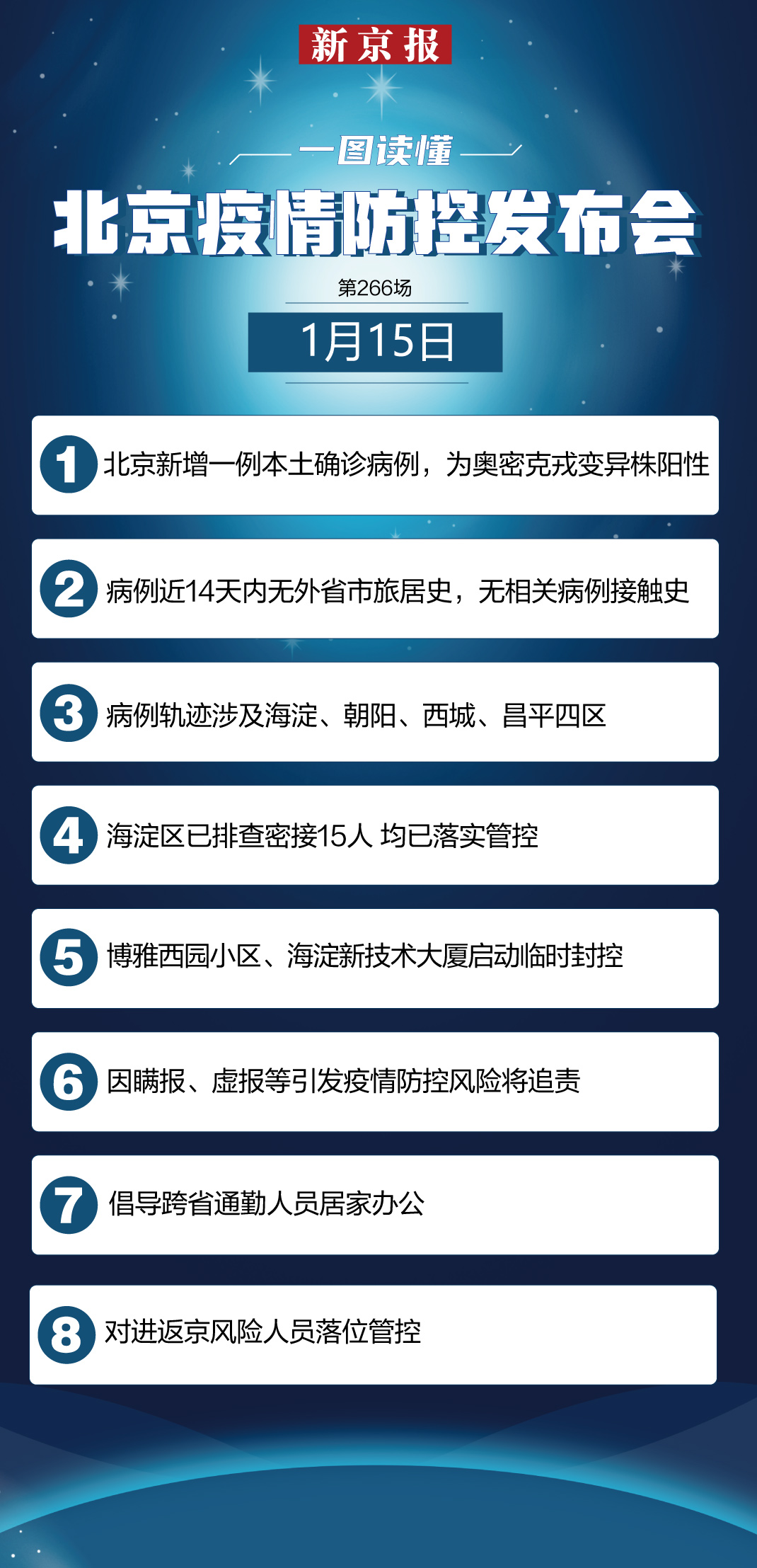 北京市委宣传部副部长、市政府新闻发言人徐和建介绍,要对进返京风险人员第一时间落位管控筛查,确保不漏一人。对有14日内中高风险地区所在县(市、区、旗)旅居史的进返京人员严格居家观察、核酸检测等措施。严防风险人员通过第三地进返京。减少人员流动,倡导跨省通勤人员居家办公。