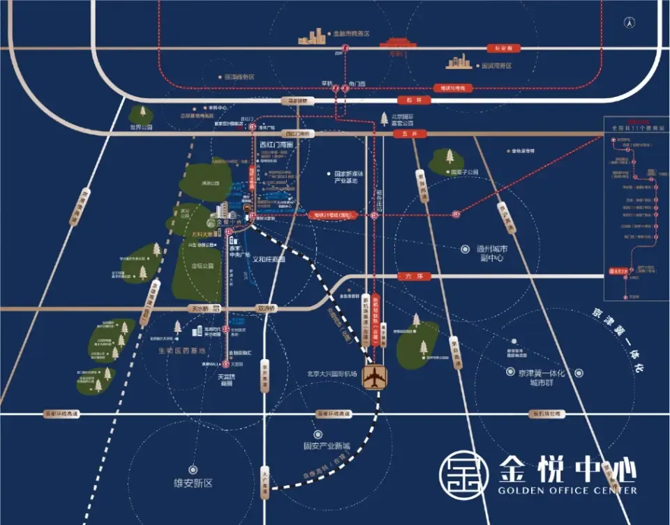 金悦中心落址于大兴新城核心,地铁4号线号线号线),坐拥五纵两横四轨的立体交通网络,舒享交通便利。