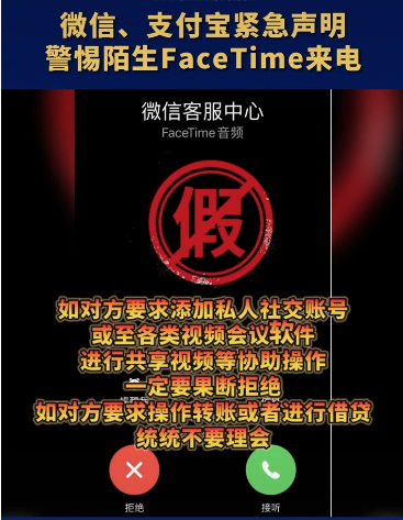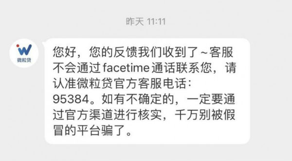 首先,大家要知道,微粒贷作为微众银行旗下的产品,这类正规的金融平台官方客服并不会采用FaceTime语音电话的方式来联系客户,这点已找官方确认。所以后期如接到冒充客服的FaceTime电话,基本可以确定是诈骗。如果自己拿不准,可以像我一样主动联系官方客服,找工作人员核实情况。