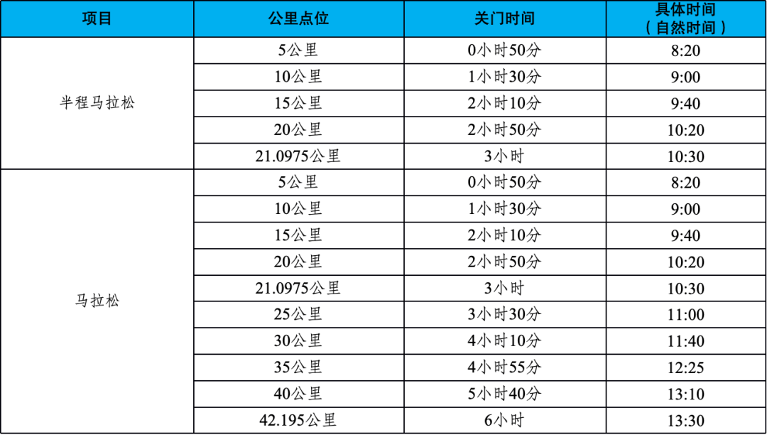 为保证参赛运动员比赛安全、顺利,比赛期间各路段距离设关门时间,分时、分路段对社会交通进行临时管控。到达关门时间后,对应公里点的计时毯停止工作,对应路段恢复社会交通。参赛运动员在规定的关门时间内,未跑完对应路段距离的须立即停止比赛,退出赛道,以免发生危险。退出赛道的运动员可到路线沿途就近的收容站搭乘收容车前往终点取衣。