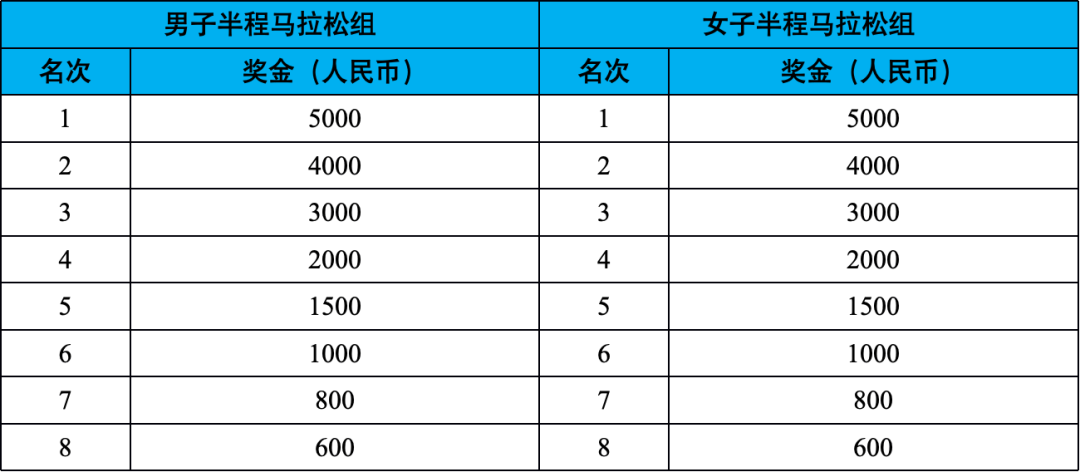 按净计时成绩分别录取男女前3名上台领奖,按净计时成绩分别录取男女第4至8名给予奖励,具体奖励标准(见下表,单位:元/人民币)。